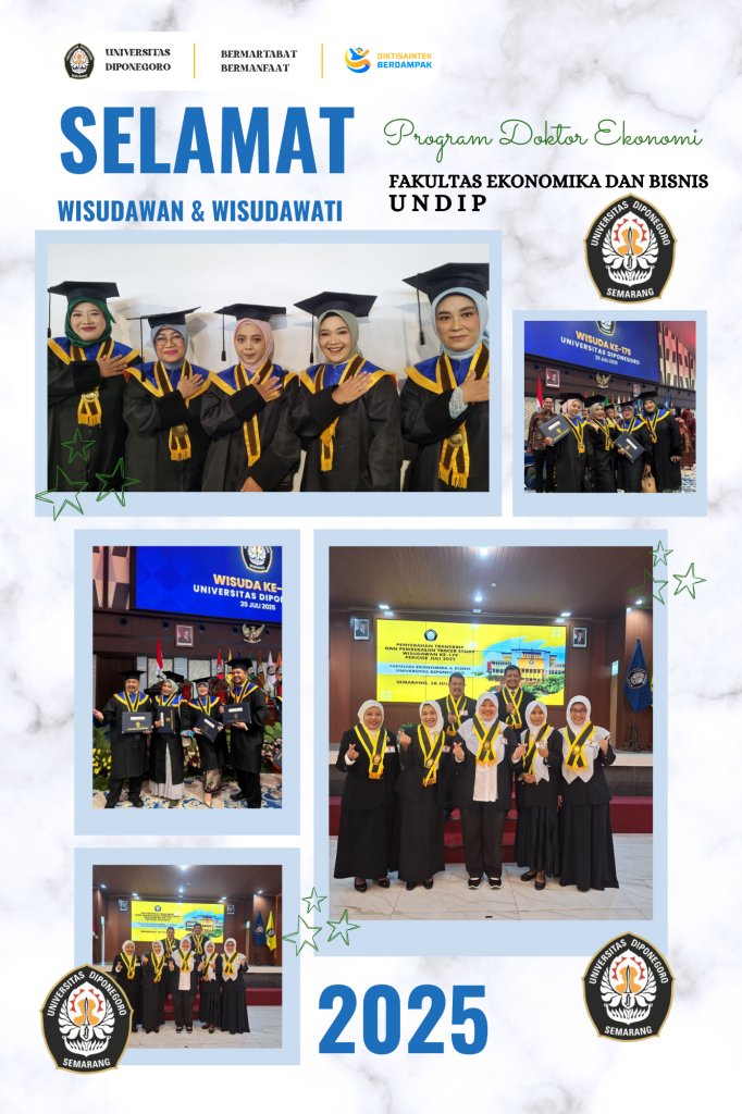 Seluruh keluarga besar Program Doktor Ekonomi Fakultas Ekonomika dan Bisnis Universitas Diponegoro mengucapkan selamat dan sukses kepada para Wisudawan dan Wisudawati Periode ke-179.