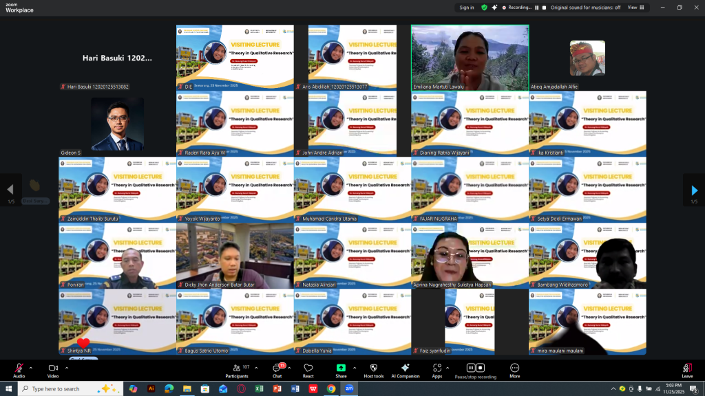 Acara Visiting Lecturer dengan topik “Theory in Qualitative Research” resmi dimulai hari selasa 25 november 2025 [Online Zoom]. Kegiatan akademik ini menghadirkan narasumber utama Dr. Nunung Nurul Hidayah, seorang Associate Professor in Accounting dari University of Southampton, United Kingdom, yang dikenal sebagai pakar dalam bidang penelitian kualitatif dan akuntansi.