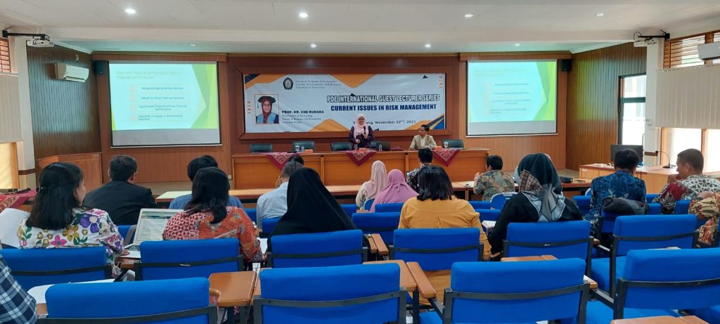 Semarang – Program Doktor Ilmu Ekonomi dari Universitas Diponegoro kembali menyelenggarakan kegiatan akademik internasional melalui PDE International Guest Lecturer Series yang mengangkat tema “Current Issues in Risk Management.” Kegiatan ini berlangsung pada 22 November 2023 di kampus Undip, Semarang, dan menghadirkan narasumber internasional Prof. Dr. Che Ruhana.